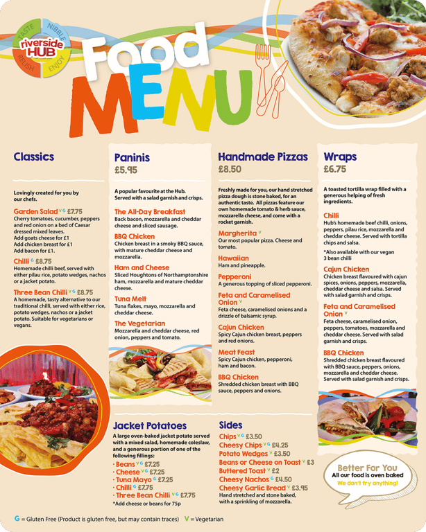 Our menu features a good balance of healthy meals and tasty treats. All the food we cook is oven baked, we do not fry anything. With good food, great coffee and free Wi-Fi (the password is ilovehub), we want to make sure that you have an enjoyable, relaxing visit.